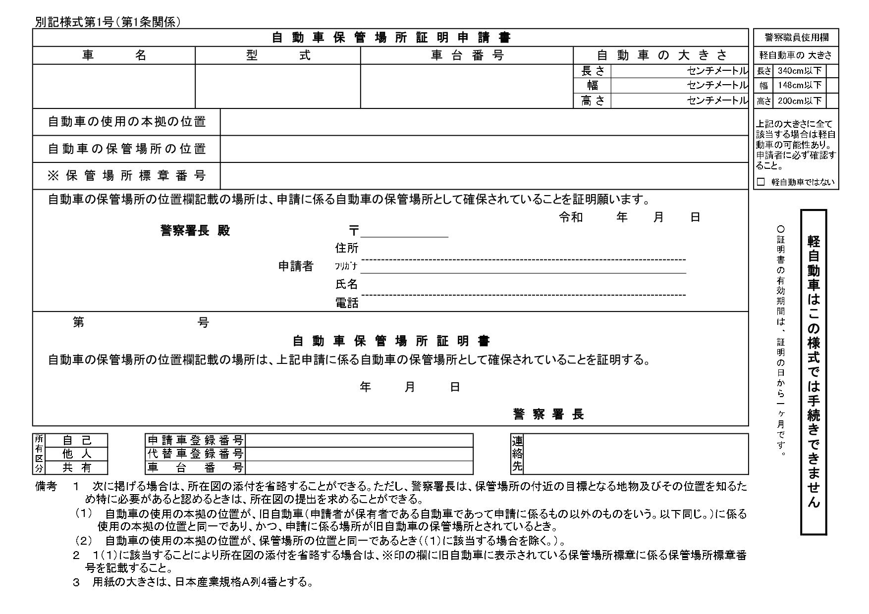 2025年4月1日より、保管場所標章(ステッカー)の廃止に伴い、千葉県では「申請書2枚(第1号様式)と申請書控え1枚」の提出となります。なお、添付書類は従来通り変更ありません。